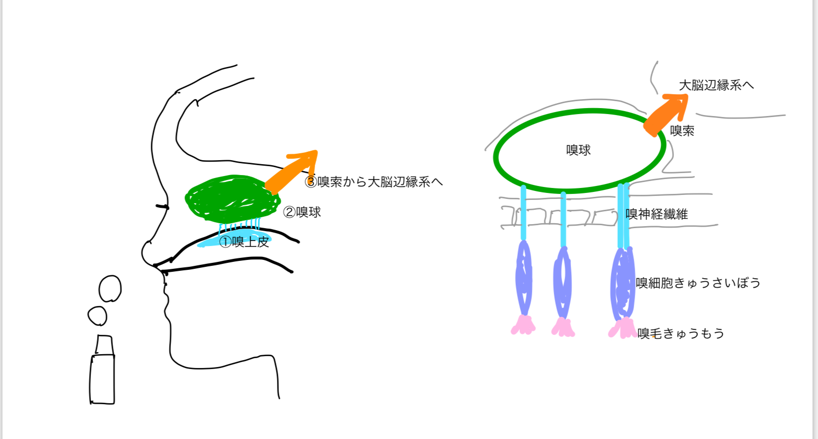 鼻から入る経路を考えてみます。精油の香り成分は、鼻から入ると、鼻の奥にある嗅上皮(きゅうじょうひ)でキャッチされます。そこで受け取られた香りの情報は電気信号となってわずか0.2秒という瞬間的な速さで嗅細胞から出ている嗅毛から嗅神経を通り、嗅球、嗅索を駆け巡って大脳辺縁系へ伝わるといわれています。そして脳の中(=嗅覚野)で「あ、これは○○の香りがする」と私たちは認識します。