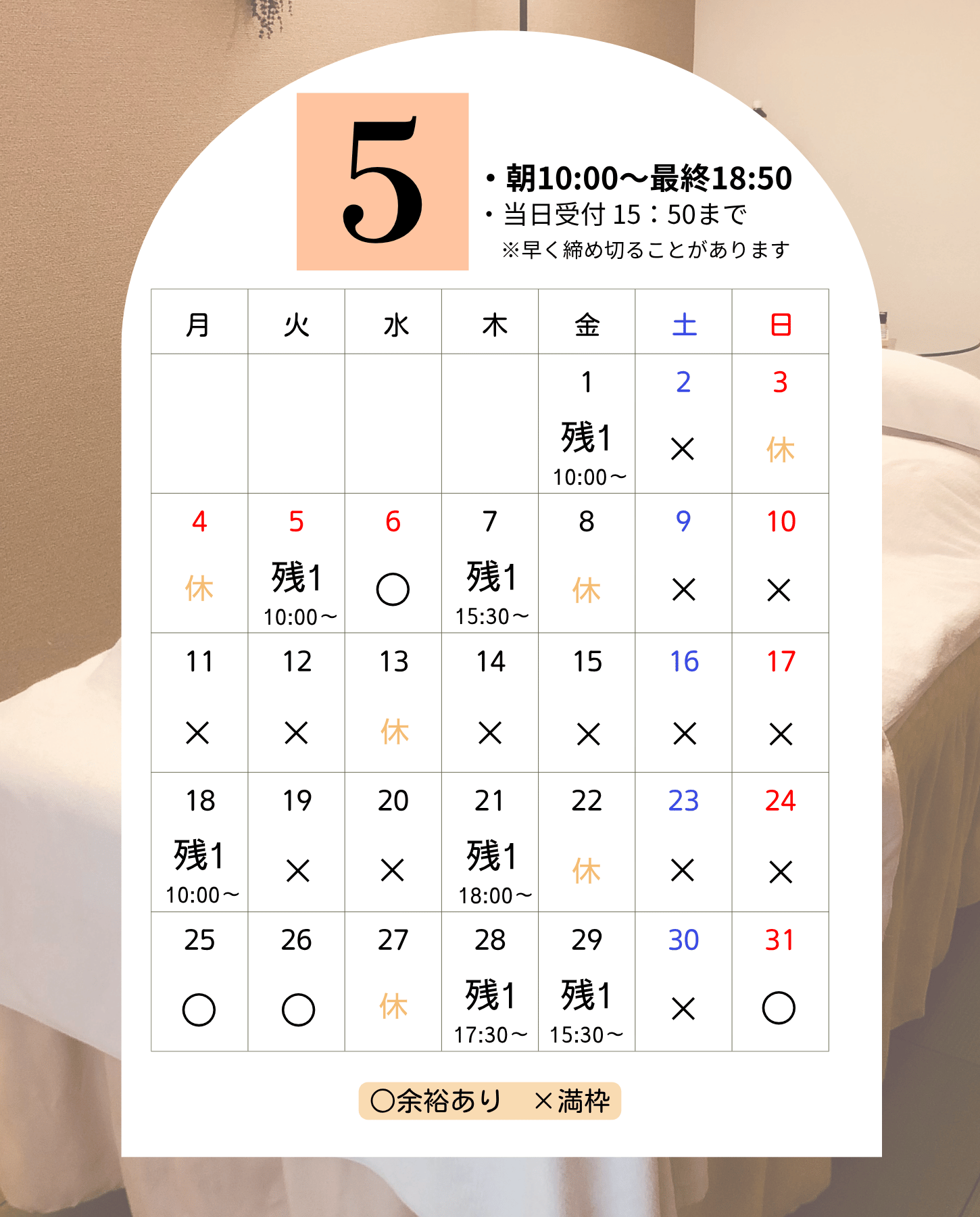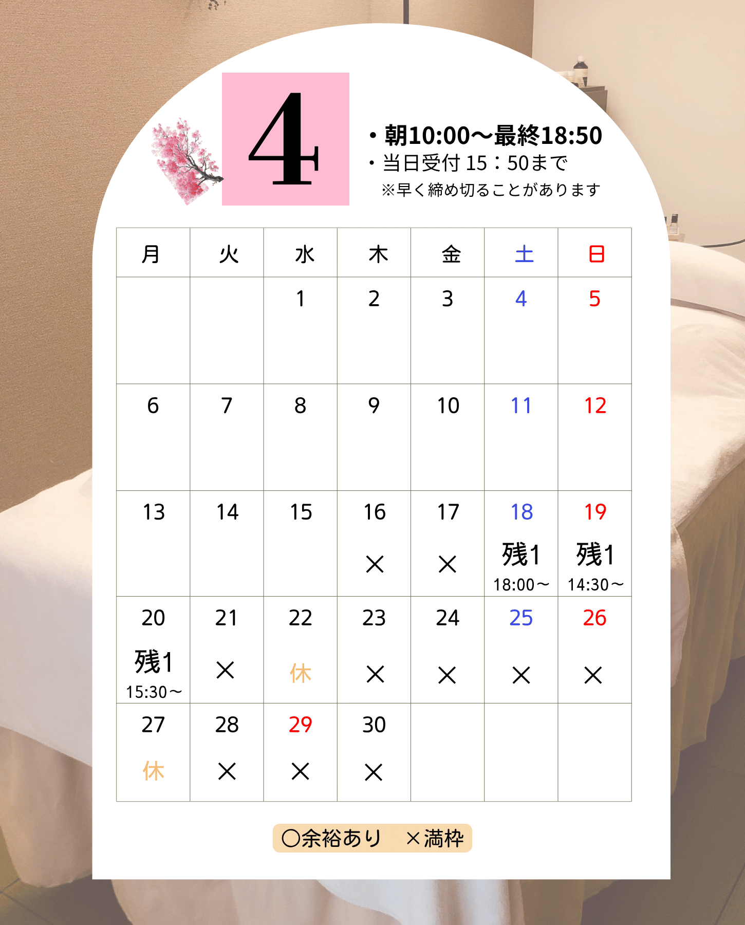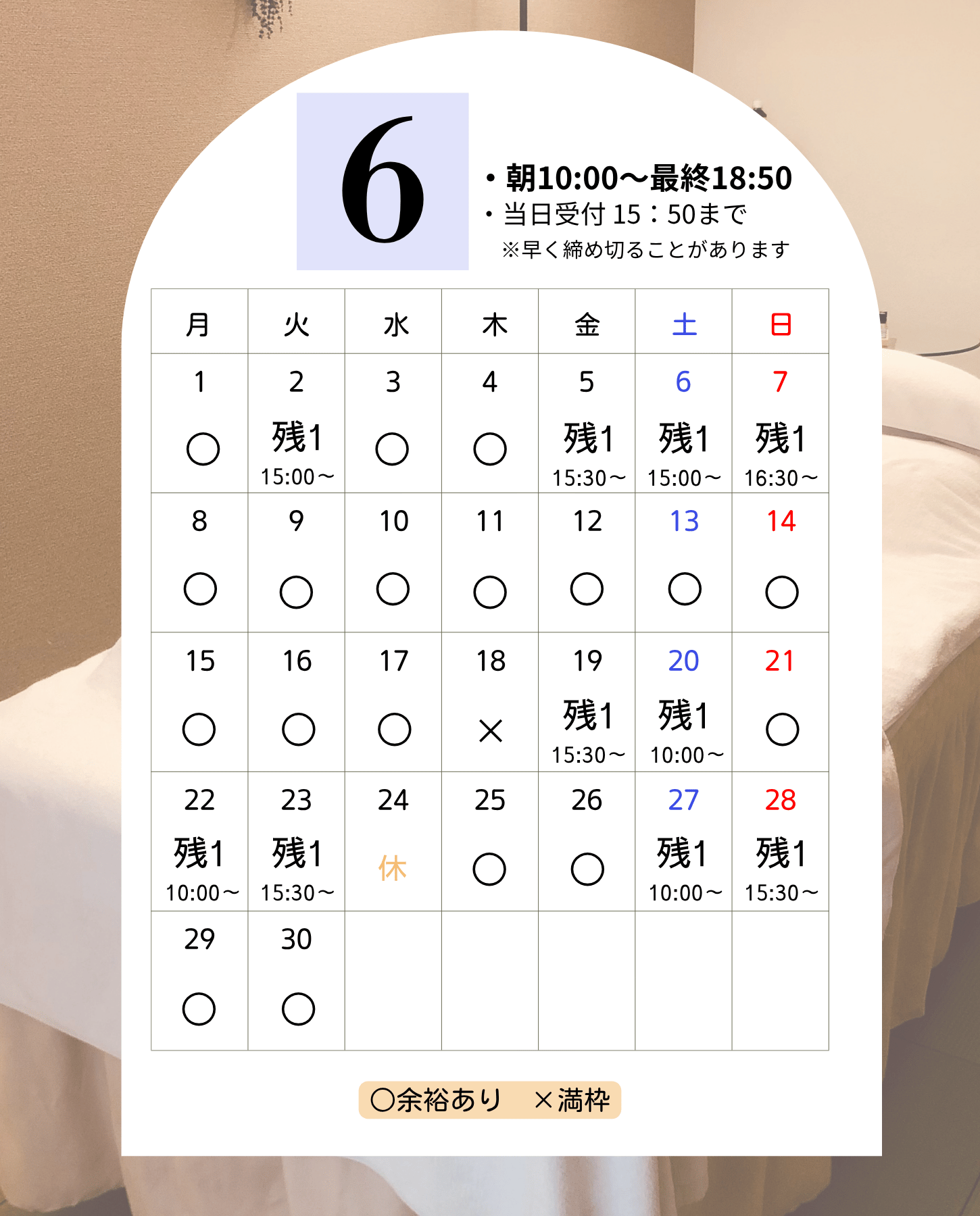 随時更新しています。「✕」の日でもキャンセル待ちを受け付けております。お気軽にLINEにメッセージをください。